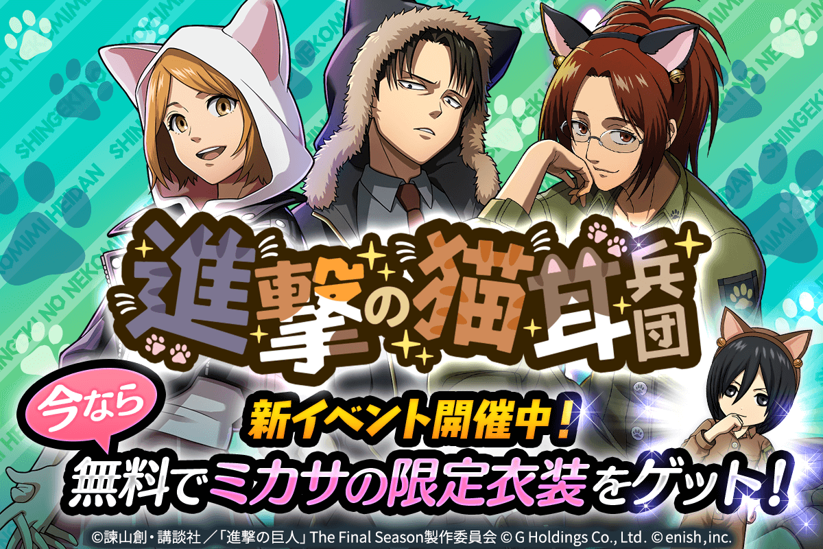 8月15日(月)より、新イベント「進撃の猫耳兵団」を開催!限定ミッションをクリアしてミカサの猫耳衣装をGETしよう!