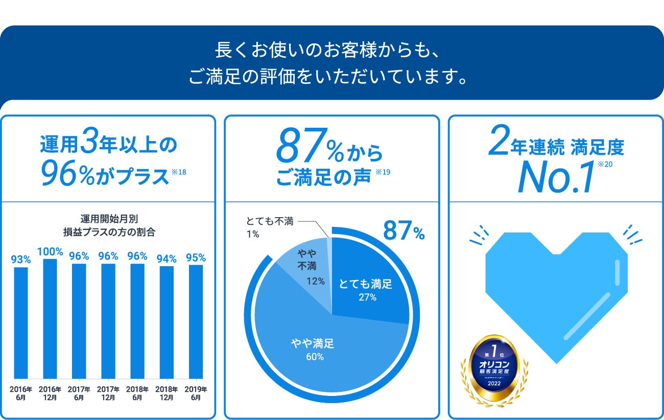 ※18 2022年6月30日時点。運用開始から3年以上経過、かつ預かり有価証券の残高がある口座のうち、運用益がプラスになっている口座の割合(小数点第1位を切り捨て)