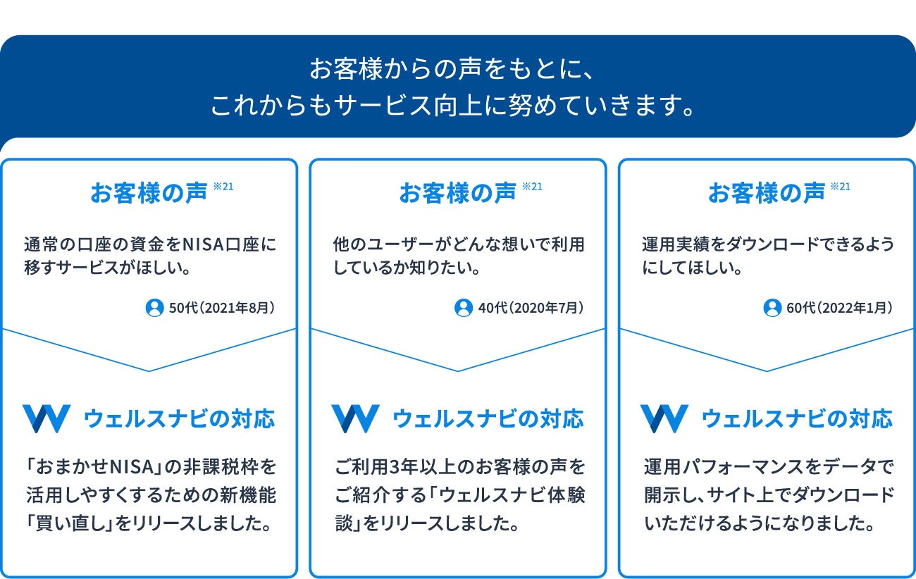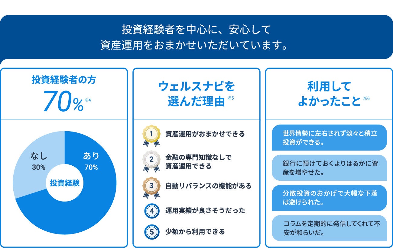 ※6 2022年7月18日に実施したアンケートでの質問「WealthNaviを利用してよかったことがありましたら教えてください。」に対する回答より。個人の投資体験談であり、将来の運用成果等を示唆または保証するものではありません。投資に関する決定は、お客様ご自身のご判断と責任のもとに行っていただきますようお願いいたします。
