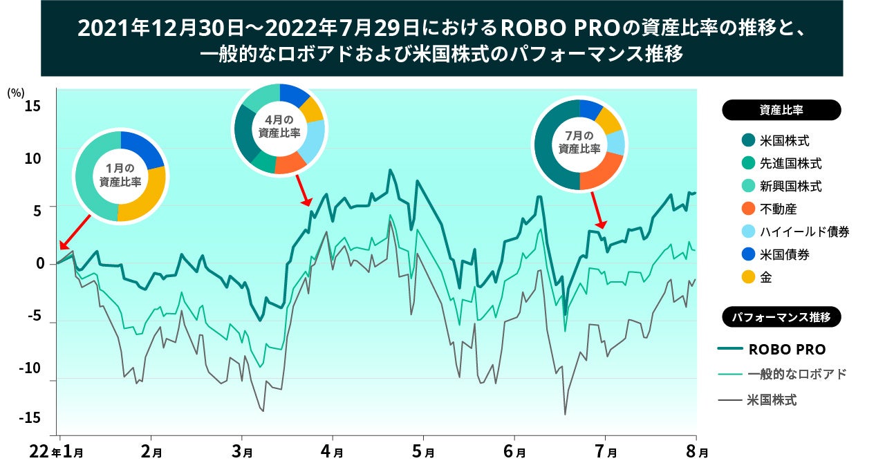 ROBO PROは、この一進一退の株式市場の動向を上手く活かし、相場に合わせて、フレキシブルに資産配分を変えたことにより、2022年初から2022年7月29日の期間において+6.10%のリターンを獲得することができました。