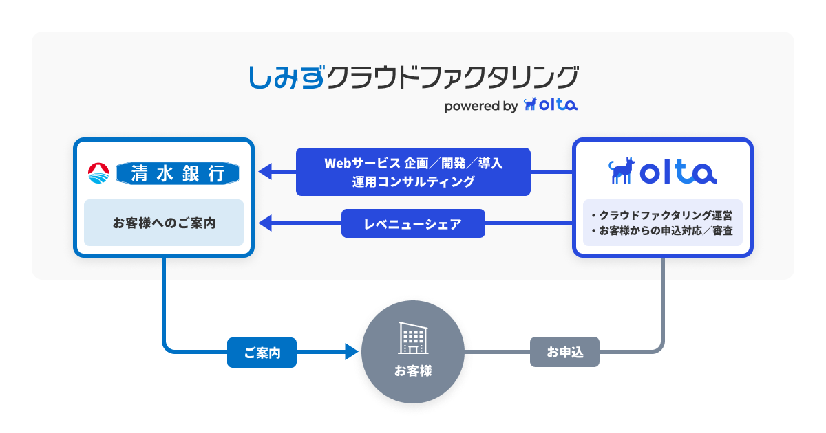 OLTAと清水銀行とのクラウドファクタリング事業における提携では、OLTAがWebサービスの企画・開発・導入および運用におけるコンサルティングを清水銀行に提供し、清水銀行は自社ブランドの金融商品のサービスラインナップに加え、法人・個人事業主のお客様にご案内します。