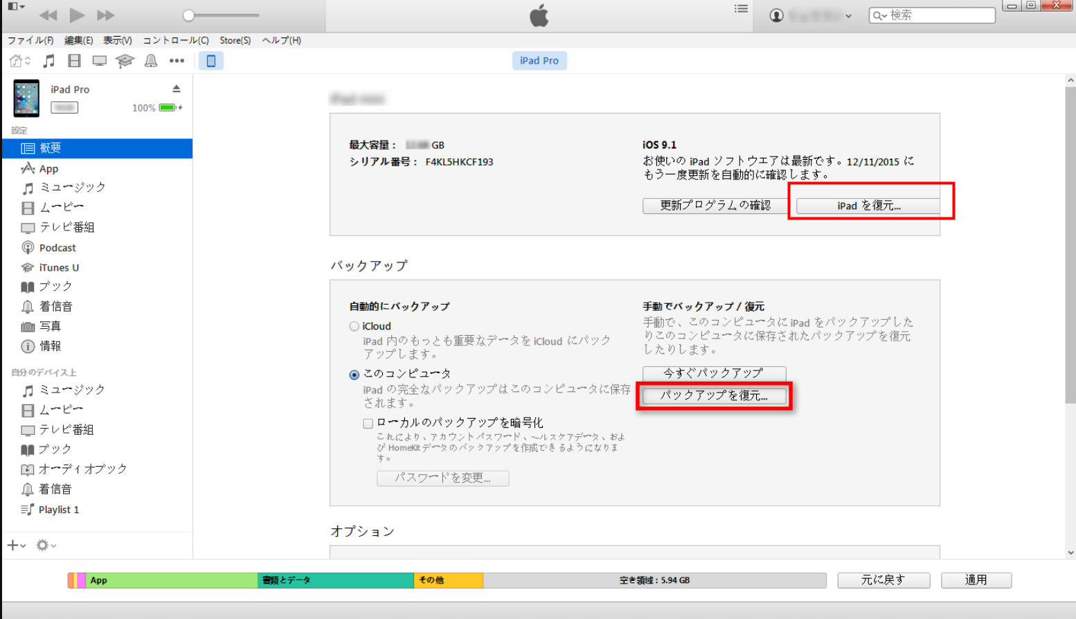 2.iPadの管理画面に入ります。「iPadを復元」をクリックします。
