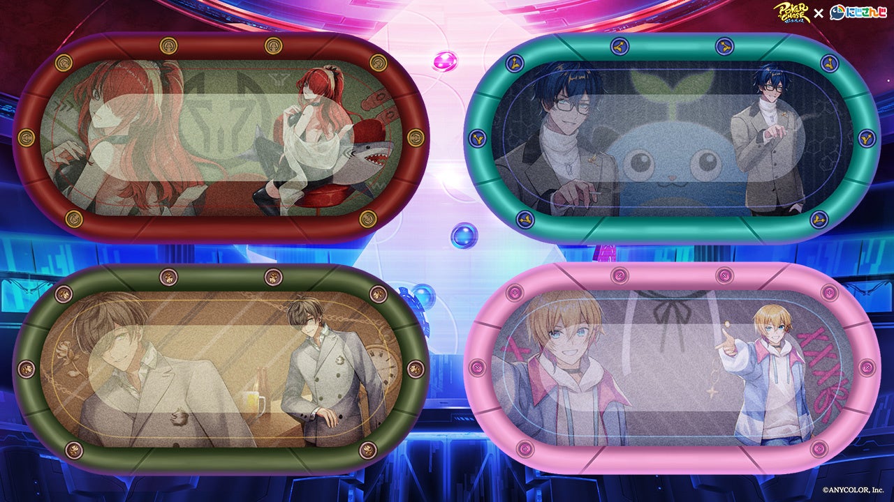 総勢40名以上の「にじさんじ」ライバーが参加したポーカー大会「NNOP2022」 決勝で熱戦を繰り広げた「成瀬鳴」さん、「レイン・パターソン」さん、そして同大会の実況席を盛り上げていただいた「レオス・ヴィンセント」さん、「オリバー・エバンス」さんの4名が『ポーカーチェイス』内のプレイアブルキャラとして期間限定で実装されます。