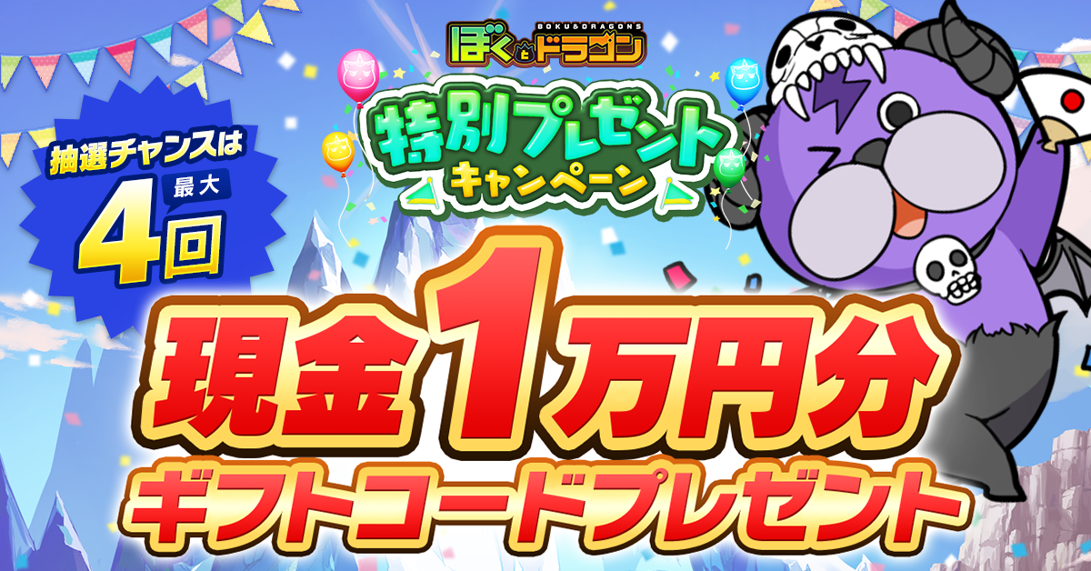 本キャンペーンは、『ぼくとドラゴン』をプレイすると、毎週1名様に10,000円分のギフトコードが当たるプレゼント企画になります。