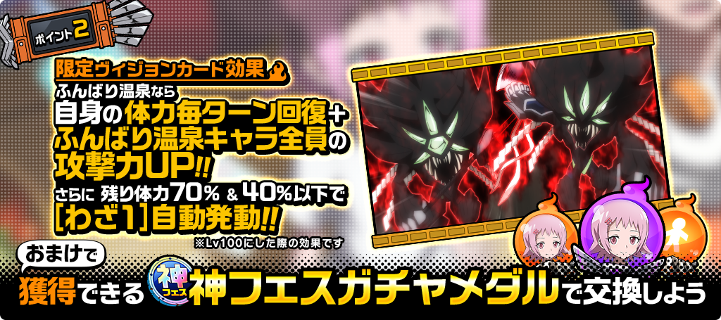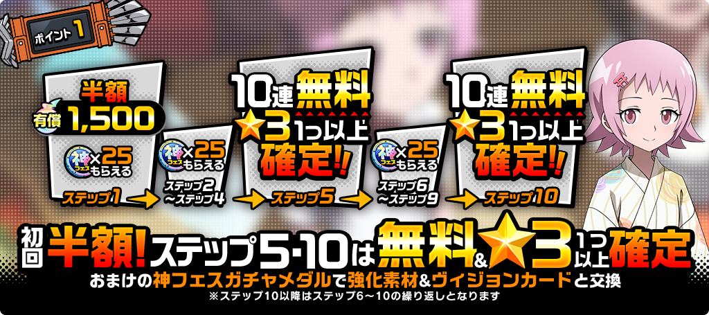 「有償たま」の消費によるガチャも登場。同ガチャでは、初回の10連が半額の「1,500たま」で回せます。さらに、強化素材やヴィジョンカードと交換できる神フェスガチャメダルが手に入る他、50連や100連まで進むと、10連が無料&★3キャラが確定いたします。是非この機会にGETしましょう!