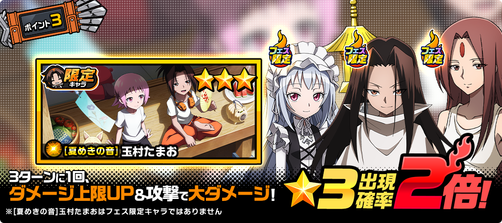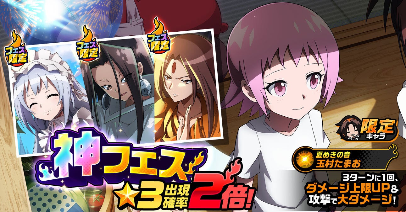 8月15日(月)より、神フェスを開催いたします!神クラスのキャラが登場する他、新キャラ「[夏めきの音] 玉村たまお(CV: 水樹奈々)」も登場。期間中はフェス限定キャラと新キャラの提供割合がアップしております。