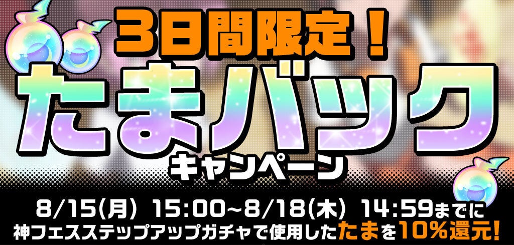 期間中に有償の神フェスステップアップガチャで消費した「たま」の10%を還元いたします!配布は無償たまでの配布となります。
