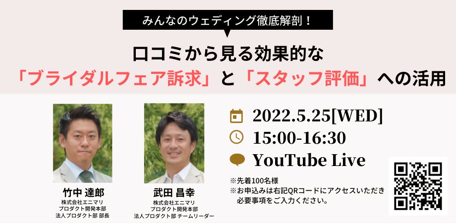 くふうグループにおいて、結婚にまつわる様々なシーンを「新しいカタチ」でお祝いしあえるサービス・メディアを展開する株式会社エニマリ( 以下「エニマリ」)は、婚礼事業に関わるすべての方を対象に、2022年5月25日(水)15時より、オンラインセミナー『みんなのウェディング徹底解剖!口コミから見る効果的な「ブライダルフェア訴求」と「スタッフ評価」への活用』を開催します。「ブライダルフェア訴求における他社との差別化」や「カップルからの反響をスタッフの評価に還元するための体制構築」など、結婚式場が抱える課題を解決し、ブライダルイベントをより魅力的なものにしたいという想いから、本セミナーを企画しました。