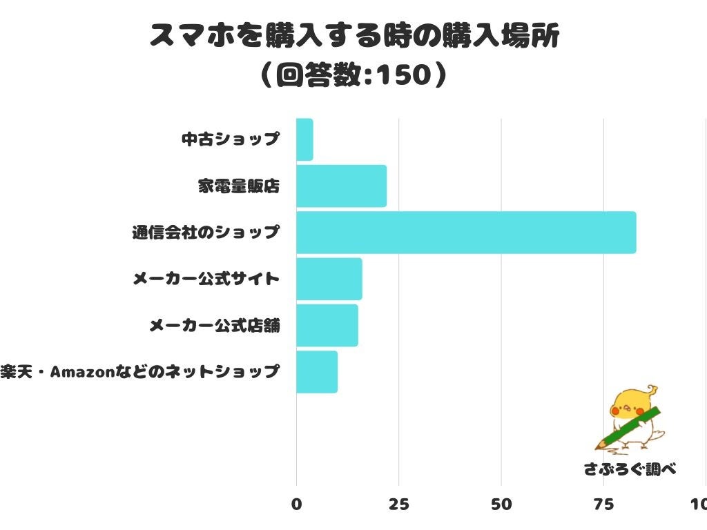スマホを購入する時の購入場所をアンケートにて調査したところ、1位は「通信会社のショップ」でした。