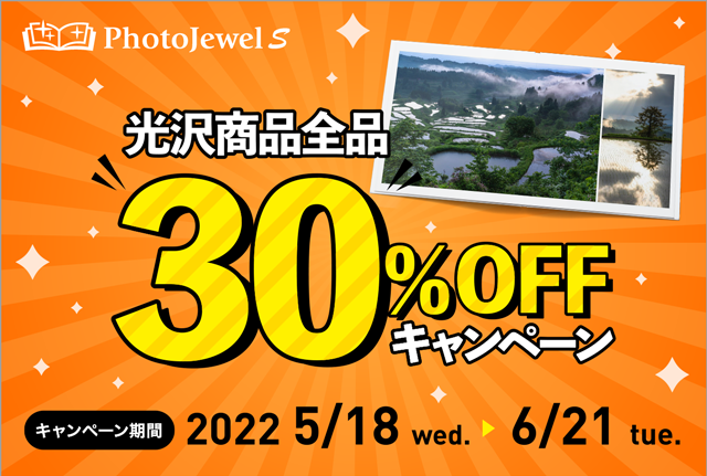 内容:PhotoJewel Sの光沢商品(全41種)を30%OFFでご購入できるクーポンをご利用いただけます。