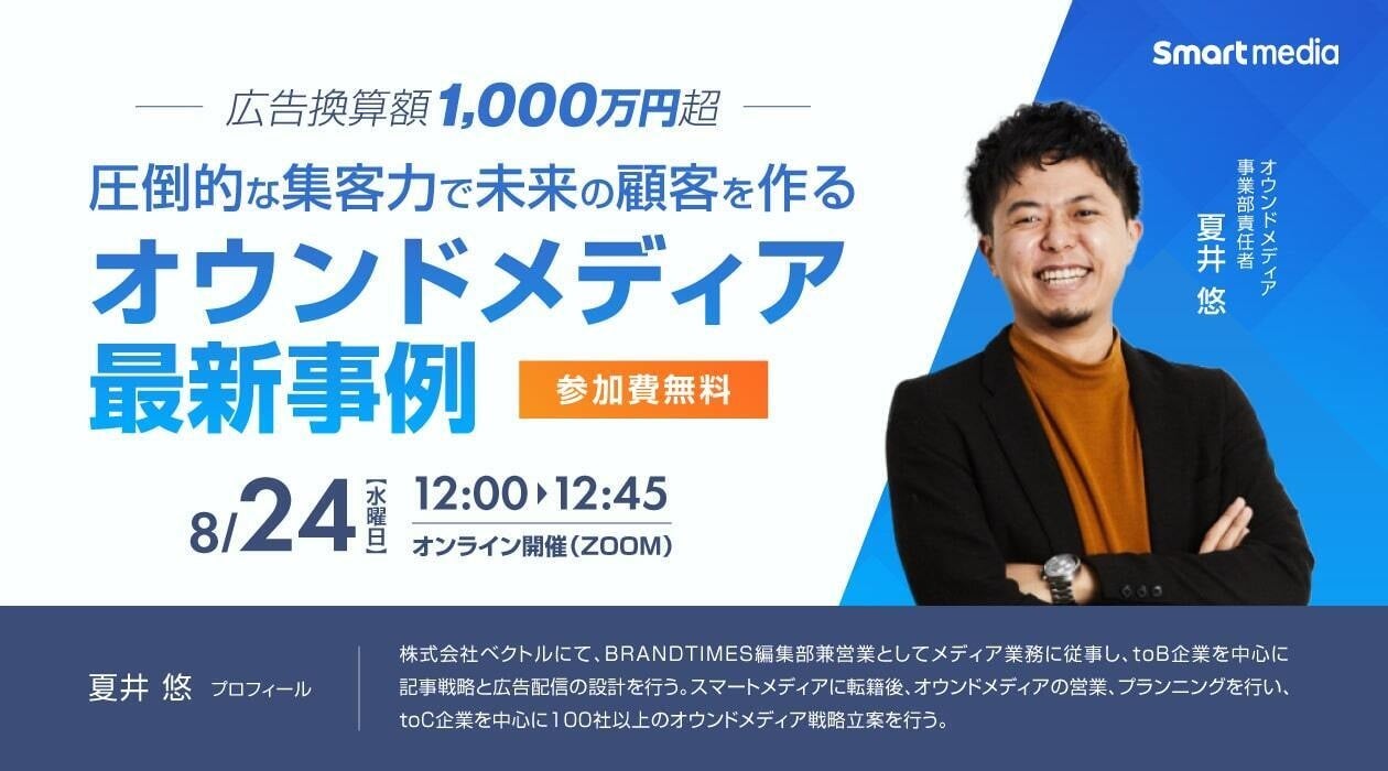 本セミナーでは、過去750サイト以上のオウンドメディアを構築してきたスマートメディアが培ったノウハウから、潜在顧客の集客から売り上げに繋がるオウンドメディアの構築戦略を一挙公開。実際に、集客において圧倒的な成果を出したオウンドメディアの最新成功事例を3社ご紹介します。