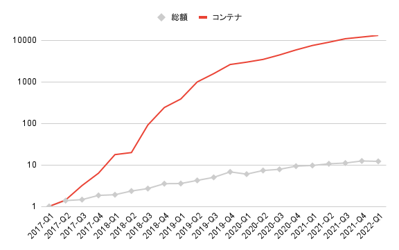 全体的にいずれのサービスも増加傾向ですが、近年の傾向として特にコンテナの急伸が目立ちます。
