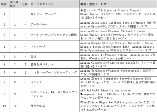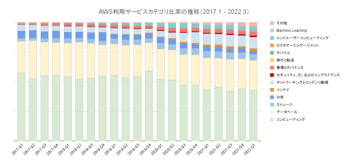 また、全体に対する割合としては小さいですが、「セキュリティ、ID、およびコンプライアンス」「管理とガバナンス」も徐々に比率を高めています。これはユーザー企業の各種システムについて、オンプレミスからAWSへの移行(マイグレーション)が進みつつあることや、クラウドネイティブなセキュリティ対策が広まってきていることを示しています。