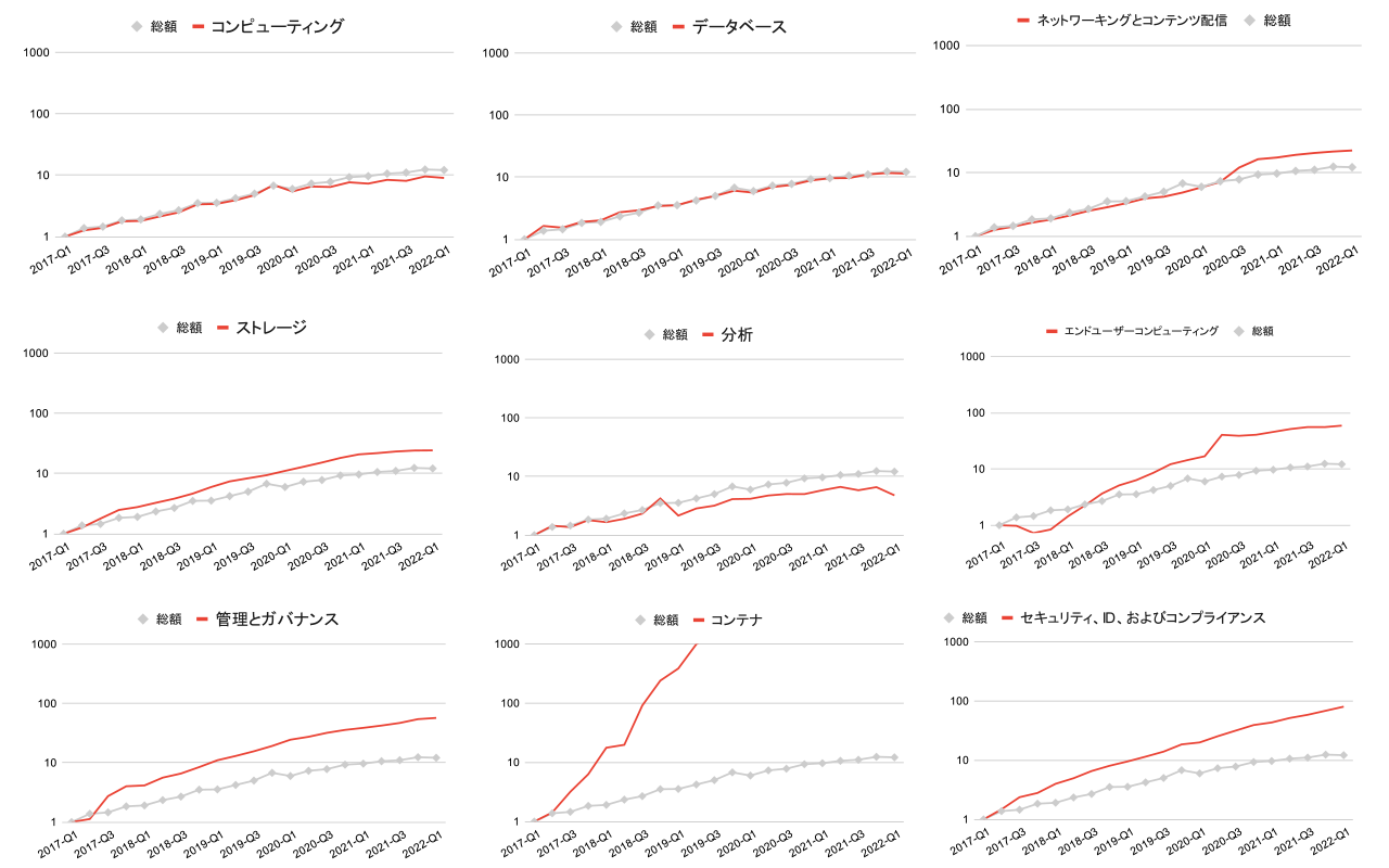 同様に利用費総額ランキングにおける1〜9位のサービスカテゴリに関して、2017年1月から2022年3月までの成長率比較も行いました。AWS利用費総額の成長率との比較により、カテゴリごとの特徴がわかります。