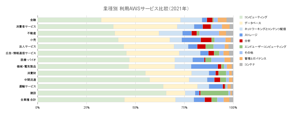 主要なAWSサービスカテゴリについて、業種ごとの利用状況の比較も行いました。