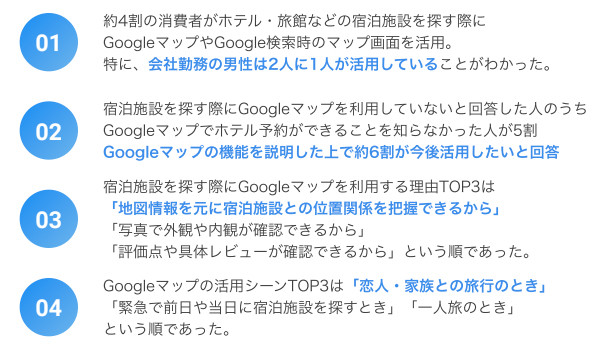 宿泊施設検索時に、Google検索やGoogleマップの対策が消費者の行動にどのような変化をもたらすのか、それに伴い集客戦略をどう再構築していくべきかについて知りたい方はぜひこちらの調査レポートをご活用ください。