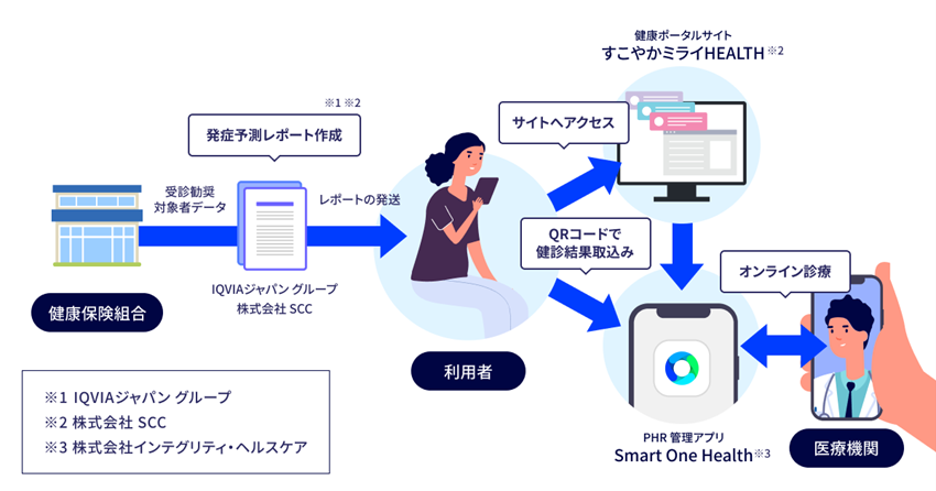 「すこやか未来ナビ」の疾病発症リスク予測サービスには、「IQVIAソリューションズ ジャパン株式会社」(本社:東京都港区、代表取締役社長:宇賀神史彦、以下「IQVIA」)が開発した発症予測モデルを採用しており、生活習慣改善のための啓発ツールとして提供することで、オンライン診療の受診動機を高め、受診率の向上を図って参ります。