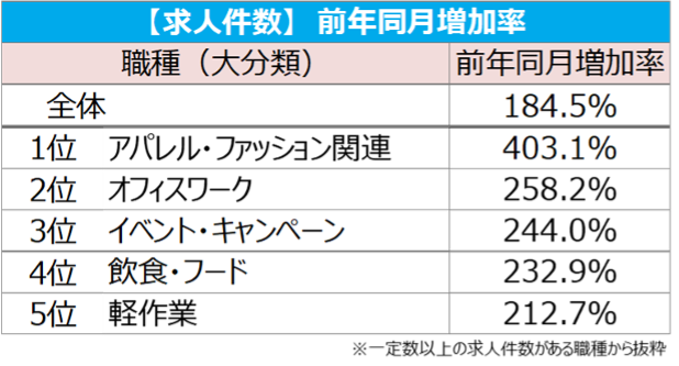 職種(大分類)別でみると[オフィスワーク]が1,242円(前月比:+19円、前年同月比:+17円)で前月比・前年同月比ともに増加し、求人件数は前年同月比で2.6倍に増加。また[アパレル・ファッション関連]が992円(前月比:+9円、前年同月比:+27円)で過去最高額となり、求人件数は前年同月比で4.0倍に増加した。