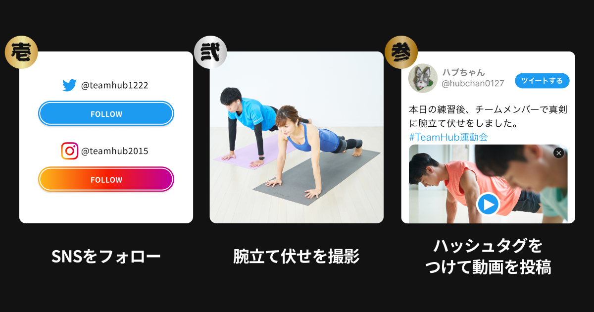 チームメイトと腕立て伏せをしている動画を撮影し、Twitter・Instagramにハッシュタグ「#TeamHub運動会」とともに投稿してください。投稿の中からおもしろく盛り上げたみなさんに豪華景品をプレゼントします!参加条件の詳細・実際の投稿はキャンペーン特設ページでご確認ください。