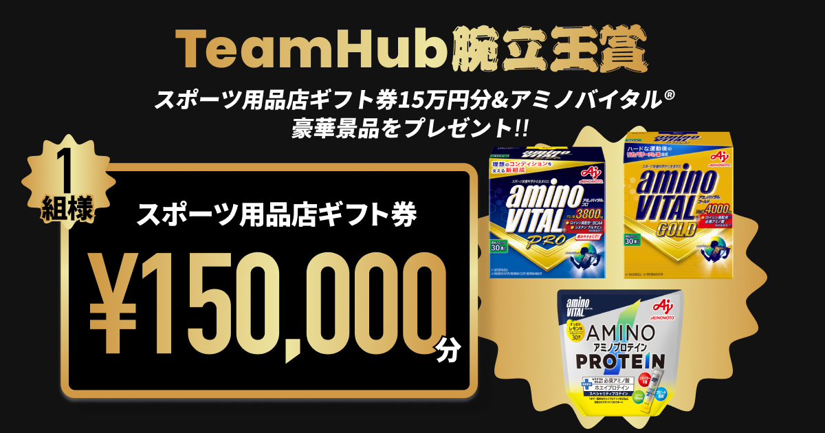 池谷直樹さんが選ぶ「TeamHub腕立王賞」受賞チームには、スポーツ用品店で使えるギフト券15万円分と、体づくりに役立つ豪華景品をプレゼント!