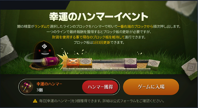 [神話]~[太古]ハドゥム闇の精霊ルーン箱やもつれた時間、カプラスの結晶等のアイテムが手に入る、幸運のハンマーイベントが開催。また、それ以外にも混沌の核や[深淵]等級のアクセサリー、遺物が手に入る幸運のビンゴイベントも開催されます。