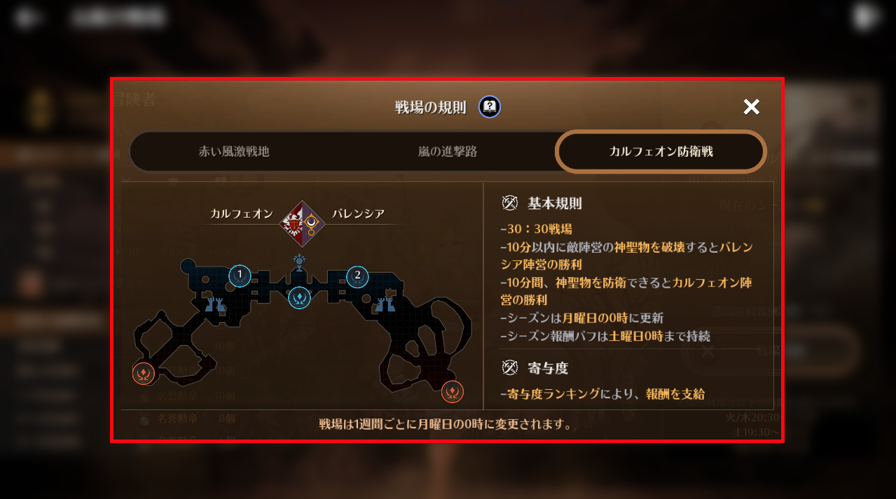 「太陽の戦場:カルフェオン防衛戦」は今まで一部の上位ギルドでのみ楽しむことが出来ていた攻城戦を、太陽の戦場という個人参加の大人数戦に落とし込み、短い時間で楽しむことが出来るように調整した新マップです。