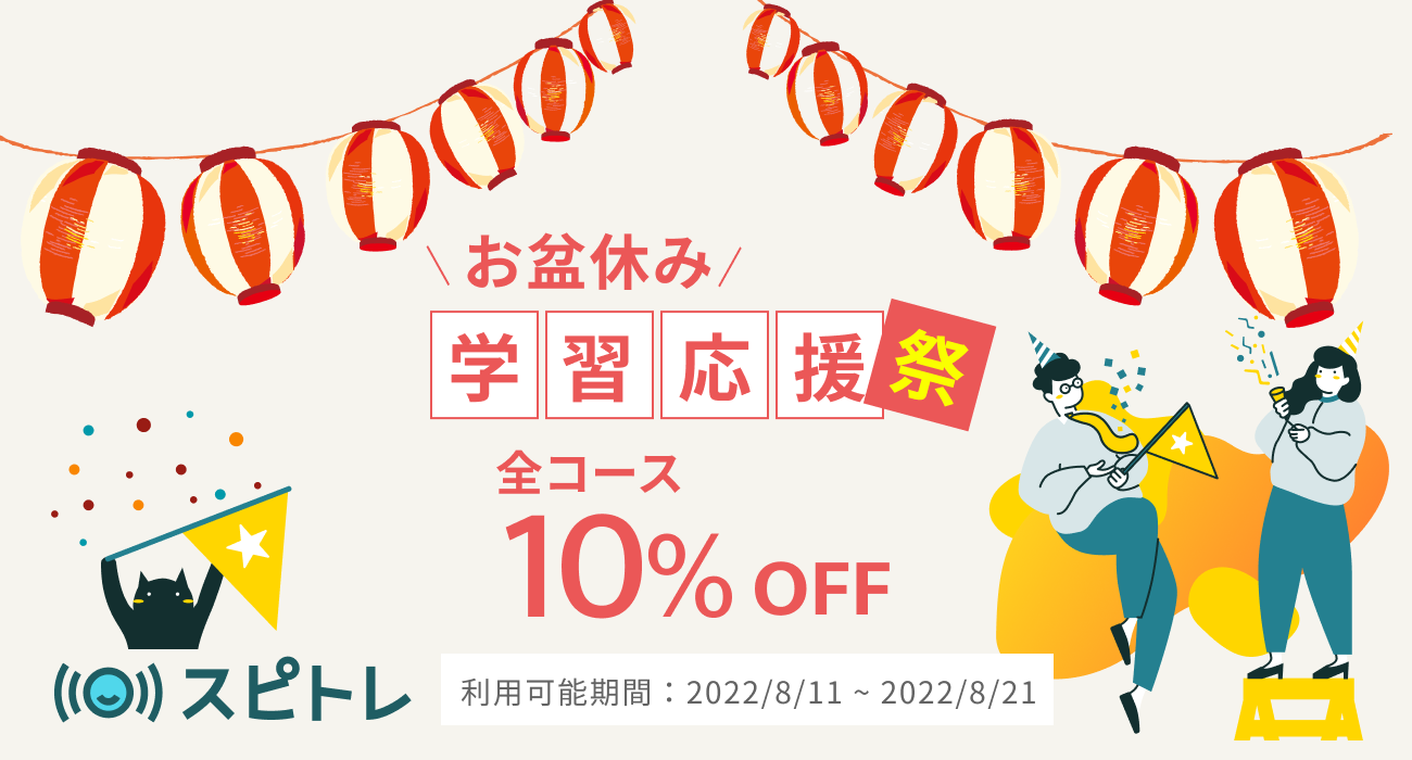 株式会社スピトレ(本社:東京都渋谷区、代表取締役社長 杉本 佳之、以下スピトレ)は、弊社が提供するビジネス英語の発話練習に特化したオンライン英語「スピトレ」のサービスにおいて、全コース10%割引になるキャンペーンを開催いたします。