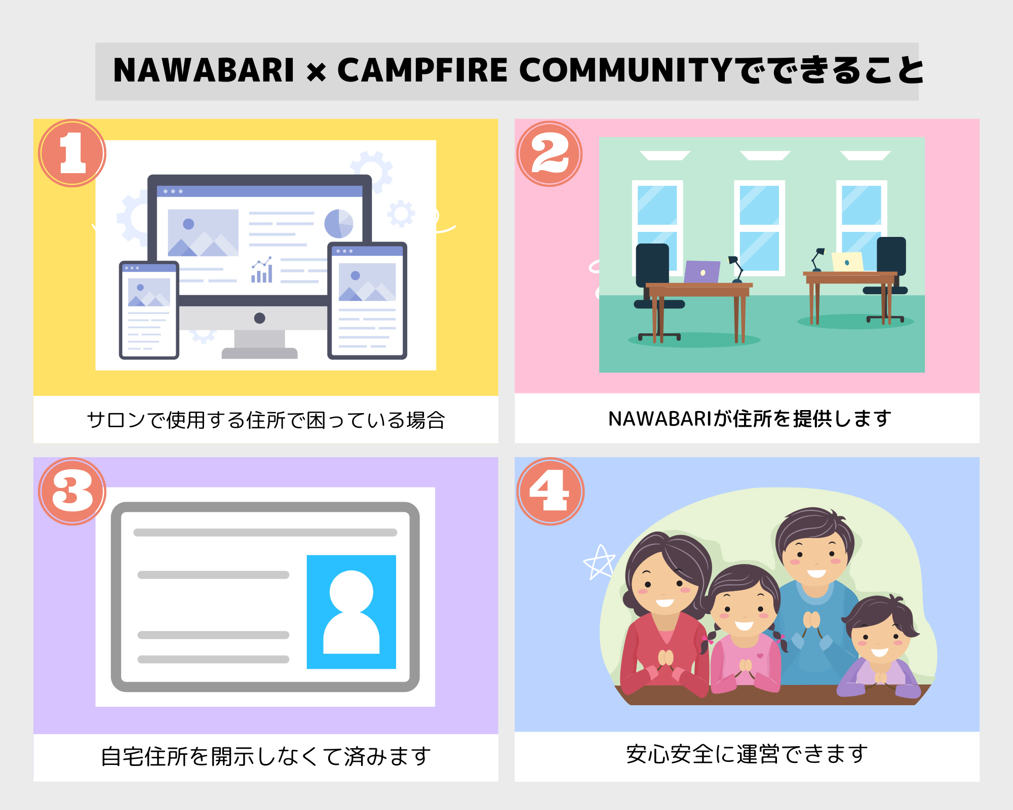 「NAWABARI」は事務所を持たない小規模事業者の方が、WEB上などに使用する住所を借りることができるサービスです。この度、日本におけるクラウドファンディングの先駆けとして知られる「CAMPFIRE」から生まれた新しいプラットフォーム、「CAMPFIRE Community」へのサービス提供が始まりました。