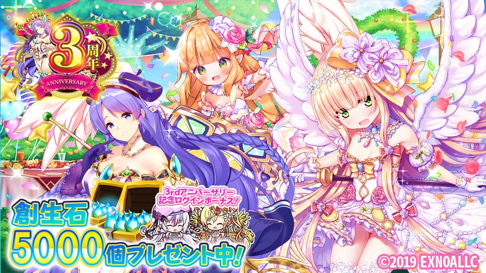 皆様の日頃のご愛顧と、3rdアニバーサリーを記念して、特別ログインボーナス「創生石5000個」をプレゼントしております。是非、この機会に3rdアニバーサリーをお楽しみください♪
