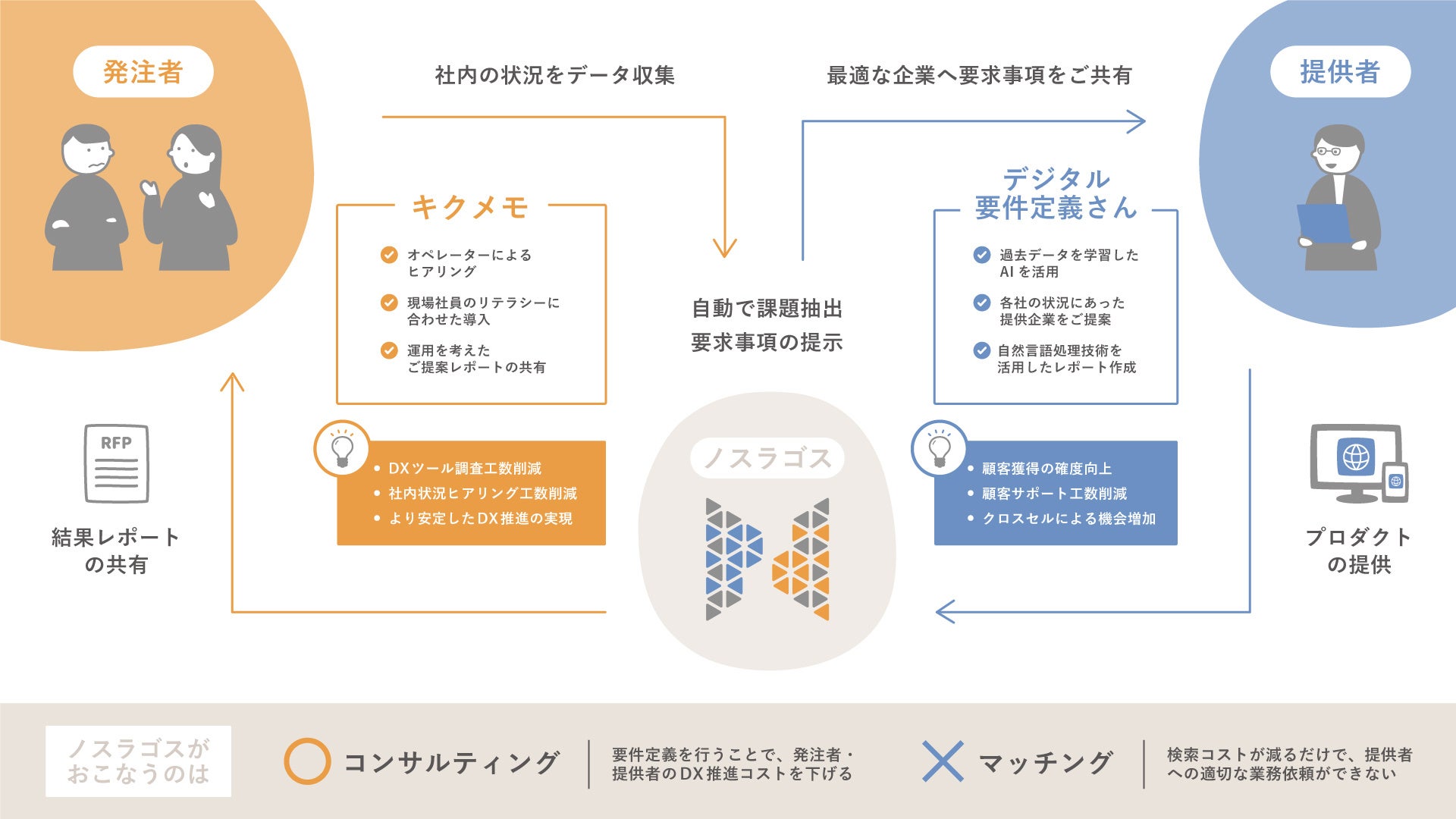 現場の業務内容に最適なソリューションの要件を自動で処理することで、ベンダーとの交渉や、ソリューションの導入時・導入後の運用・管理がスムーズに進むよう支援し、事業会社とベンダーをつなぐ架け橋として、事業会社のDX化・業務効率化に貢献することを目指しています。