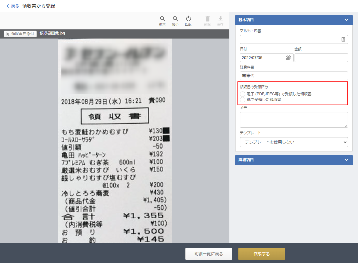 「領収書の受領区分」として、「電子(PDF、JPEG等)で受領した領収書」または「紙で受領した領収書」の選択が可能です。
