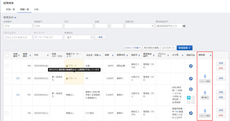 「領収書の受領区分」を選択した場合、「領収書」欄で選択内容や「明細アラート・エラー」欄でスキャナ保存要件のアラート・エラーを確認することができます。