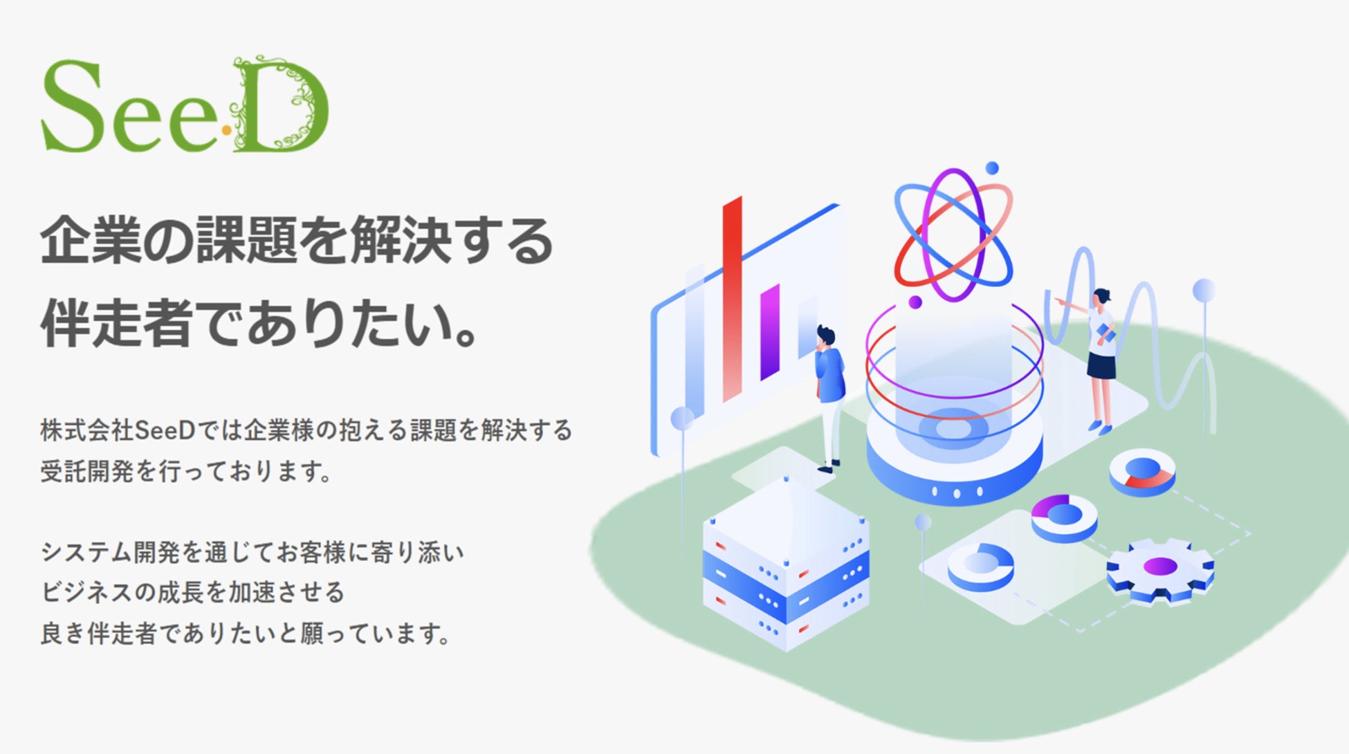 お客様が諦めかけていた機能、あるいは当初は考えてもいなかった仕組みが、当社の技術で可能になる。SeeDはシステム開発を通じてお客様に寄り添い、ビジネスの成長を加速させる良き伴走者でありたいと願っています。