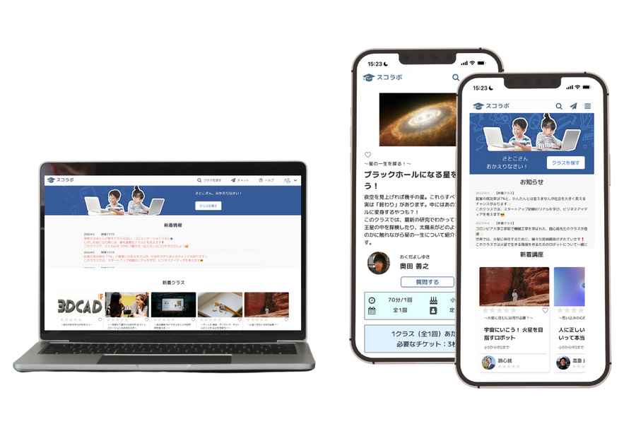 スコラボは、子どもたちが自分のロールモデルとなるような先生から、少人数オンラインライブ授業での対話を通じて直接学ぶことができるプラットフォームです。