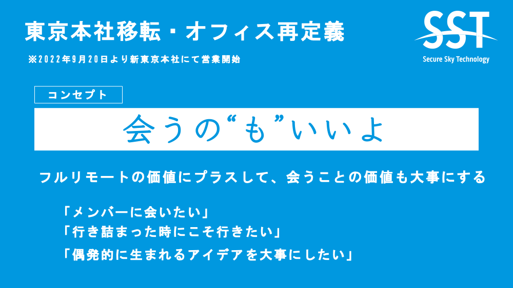 新型コロナウイルスの感染拡大に伴い、2020年2月にフルリモートへ移行後、よりSSTメンバーに適したワークスタイルの浸透と組織拡大に合わせて、東京オフィスを減床・移転いたします。