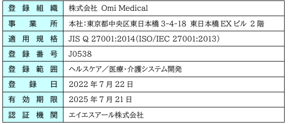 株式会社Omi Medical (本社:東京都中央区、代表取締役:ダン・ミ・ハイン、以下「Omi Medical」) は、情報セキュリティマネジメントシステム(ISMS)認証基準の国際規格「ISO 27001」の認証を全社範囲にて取得いたしました。