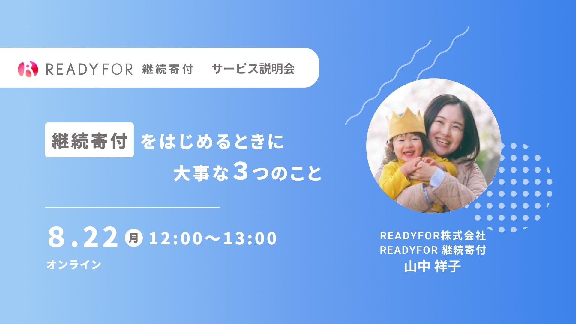 日本初・国内最大級のクラウドファンディングサービス「READYFOR」を運営するREADYFOR株式会社は、2022年8月22日(月)にウェビナー「継続寄付をはじめるときに大事な3つのこと 」を開催いたします。