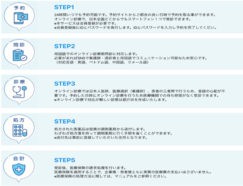 本サービス『TAKITO』は監理団体様や登録支援機関様ごとに会員登録をしていただき、特定技能外国人や技能実習生向けにより質の高いオンライン診療サービスをご提供いたします。予約から診察、会計までのプロセスは以下となります。