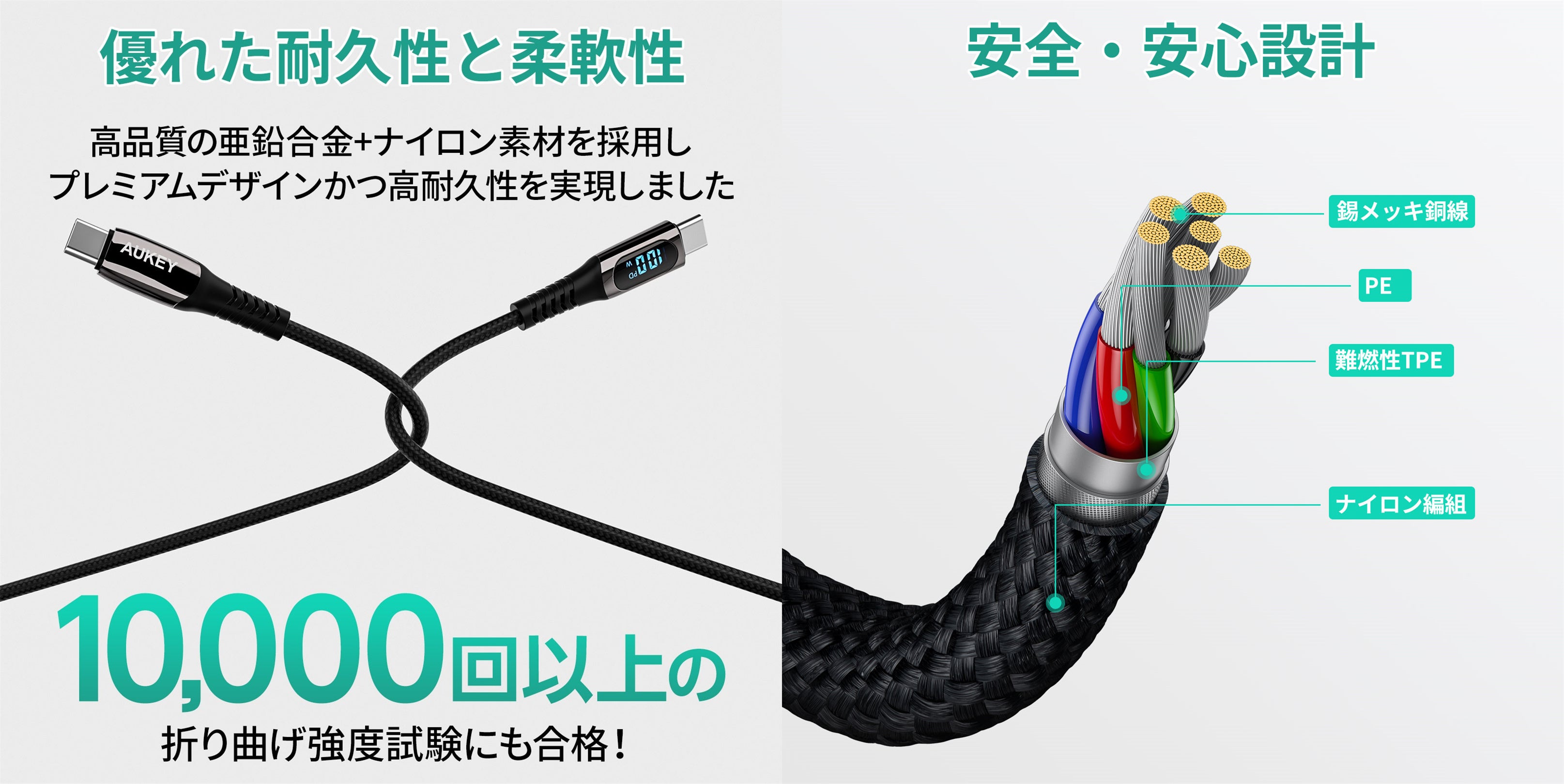デジタルディスプレイ付きUSB-C to Cケーブル「CB-CC13」想定売価1,980円(税込)は、リーズナブルな価格設定ながら、高品質で高い安全性を保証します。安心して長くご使用いただけます。