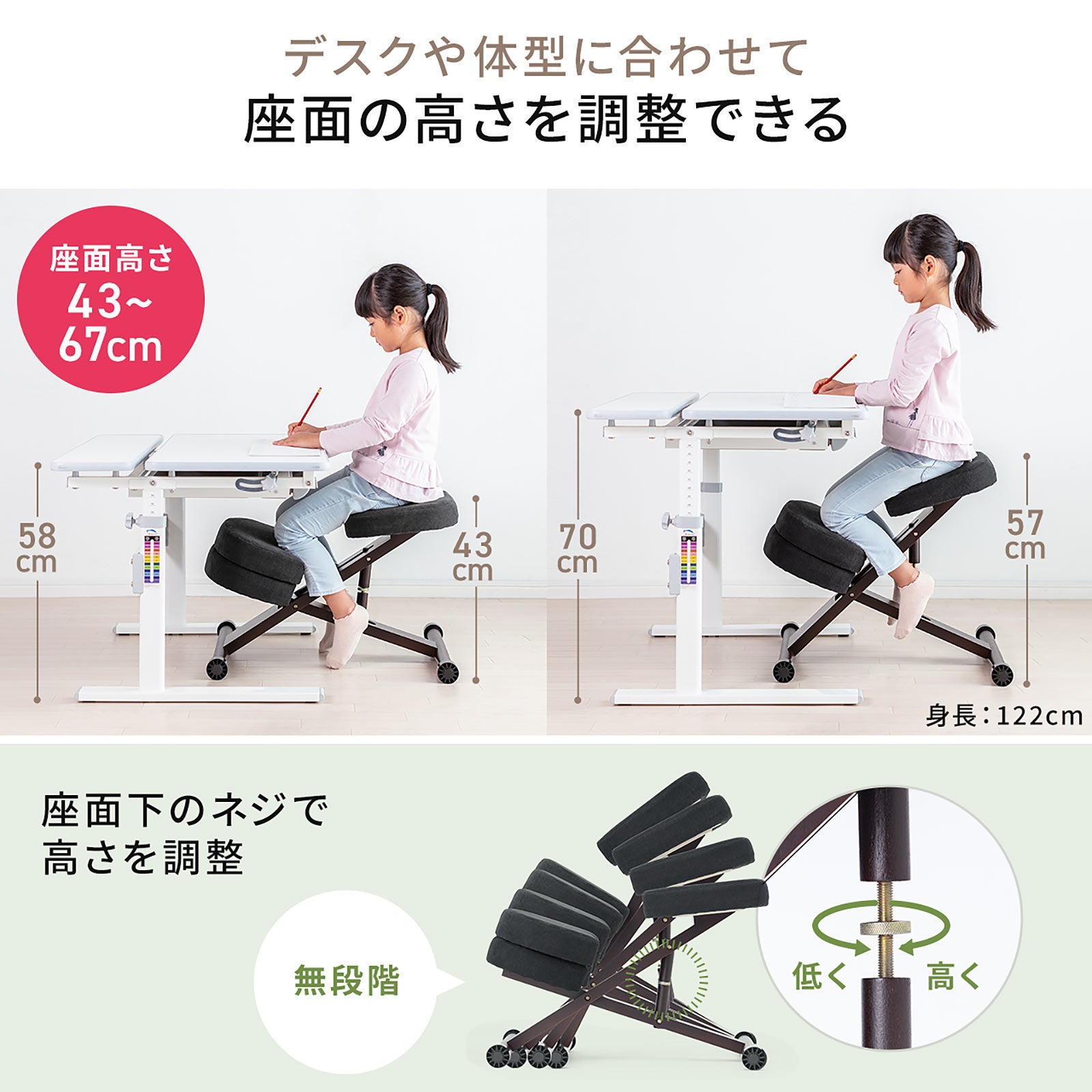 本製品は、高さ43cmまで下げて使用することが出来る低床仕様のバランスチェアです。女性やお子様にもぴったりの高さです。