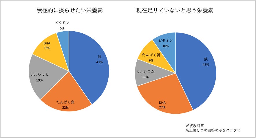 子どもに積極的に摂らせたい栄養素と現在足りていないと思う栄養素は共通して「鉄分」という結果となり、成長と発育のために鉄分を十分摂取できるような支援に需要があることがわかりました。
