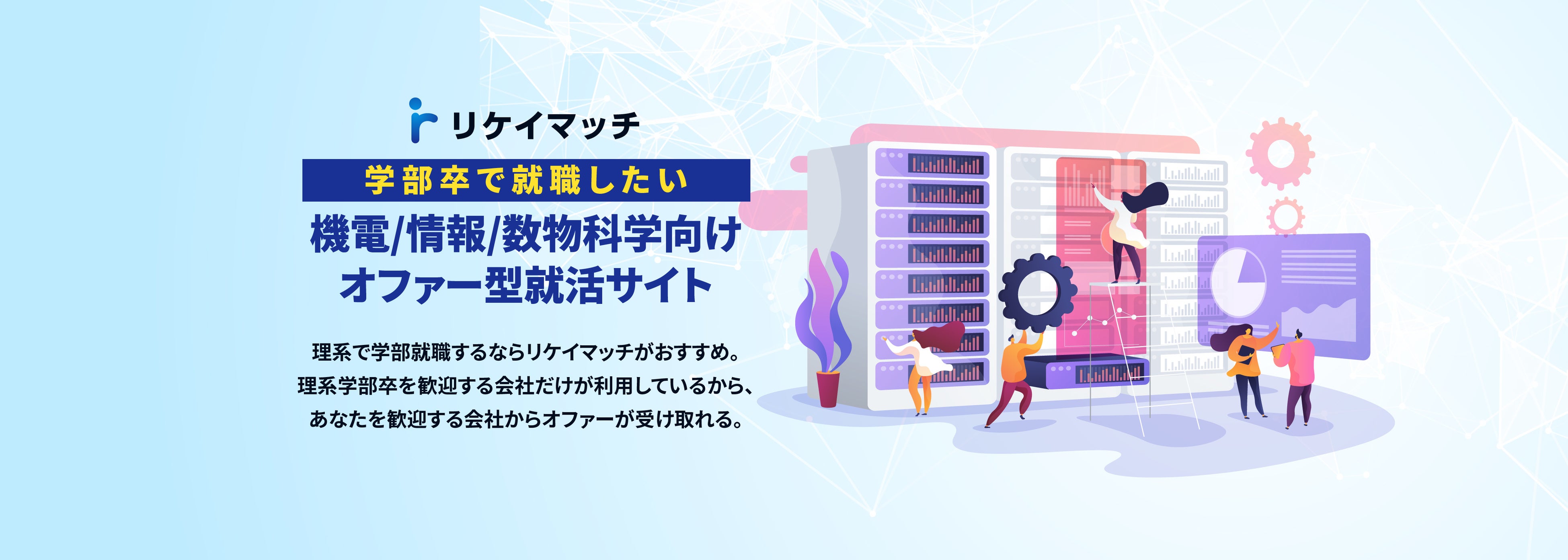 『リケイマッチ』は、ユーザーの理系学部生(機械/電気電子/情報/数物科学など)がプロフィールを登録するだけで、企業から直接スカウトを受けることができる就活サイトです。