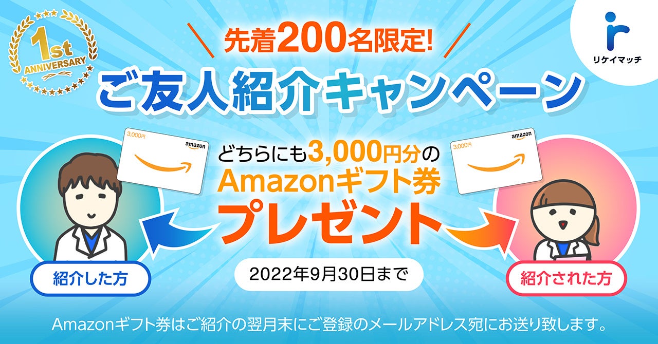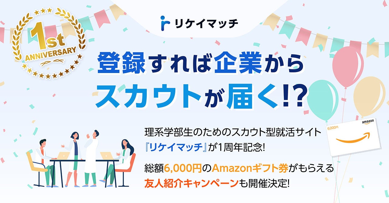 リリース1周年を記念して『リケイマッチ』は、理系学部生を対象とする友人紹介キャンペーンの実施を決定しました。プレゼントとして配布するAmazonギフト券も、過去最大金額を設定させていただきました。