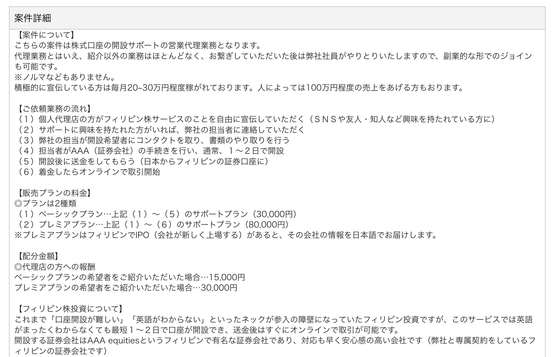 掲載例4.【高単価案件】フィリピンの証券口座開設営業代行業務