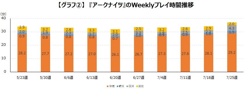 続いてプレイステイタスを見ていきます。7月11週は他の週と比べても新規ユーザーも復帰ユーザーも少なく、7月25週の2.5周年イベントで、新規・復帰ユーザーを多く獲得していることが分かります。【グラフ②】