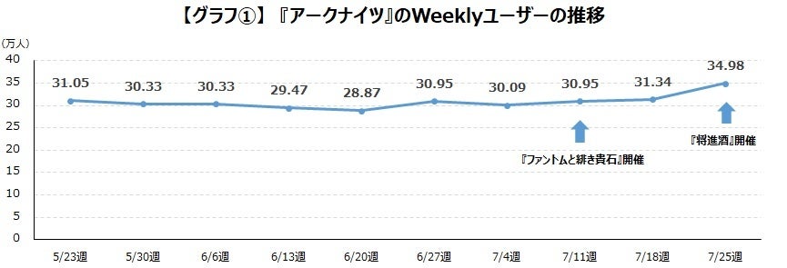 7月29日より、2.5周年を記念した大型イベントが開催されたため、7月25週に関してはアクティブ数が35万人近くまで増加していますが、全体を通して見るとおおよそ30万人程度で推移しています。【グラフ①】