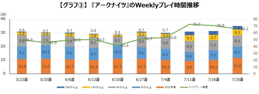 プレイ時間の推移を見ていきたいと思います。元々『アークナイツ』はモバイルゲームの中でも平均プレイ時間は長めとなっており45分程度で推移しています。常駐イベントが追加された7月11週の平均プレイ時間は72.7分と前週の7月4週と比べ1.3倍まで増加しています。アプリ全体を見ても平均プレイ時間が60分を超えるアプリは非常に少なくなっています。【グラフ③】