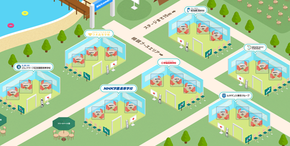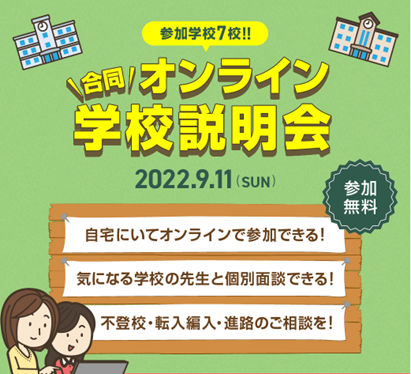 参加校は『クラーク記念国際高等学校』『ルネサンス高等学校』『ワオ高等学校』『勇志国際高等学校』『ID学園高等学校』『瑞穂MSC高等学校』『NHK学園高等学校』の7校となり、大規模な会場での対面実施の合同学校説明会と同様、参加者はオンライン上で各学校のブースに自由に訪れ、学校説明や進路についての相談をしていただくことができます。