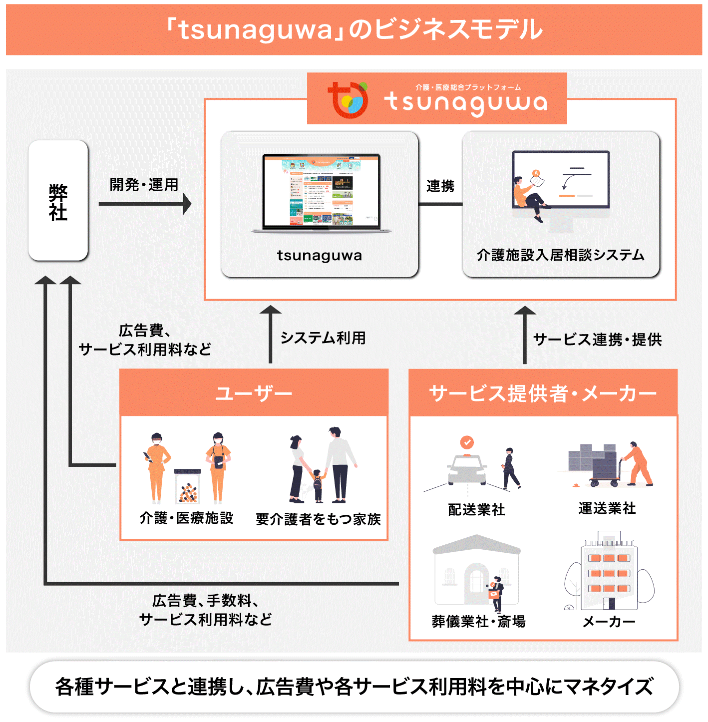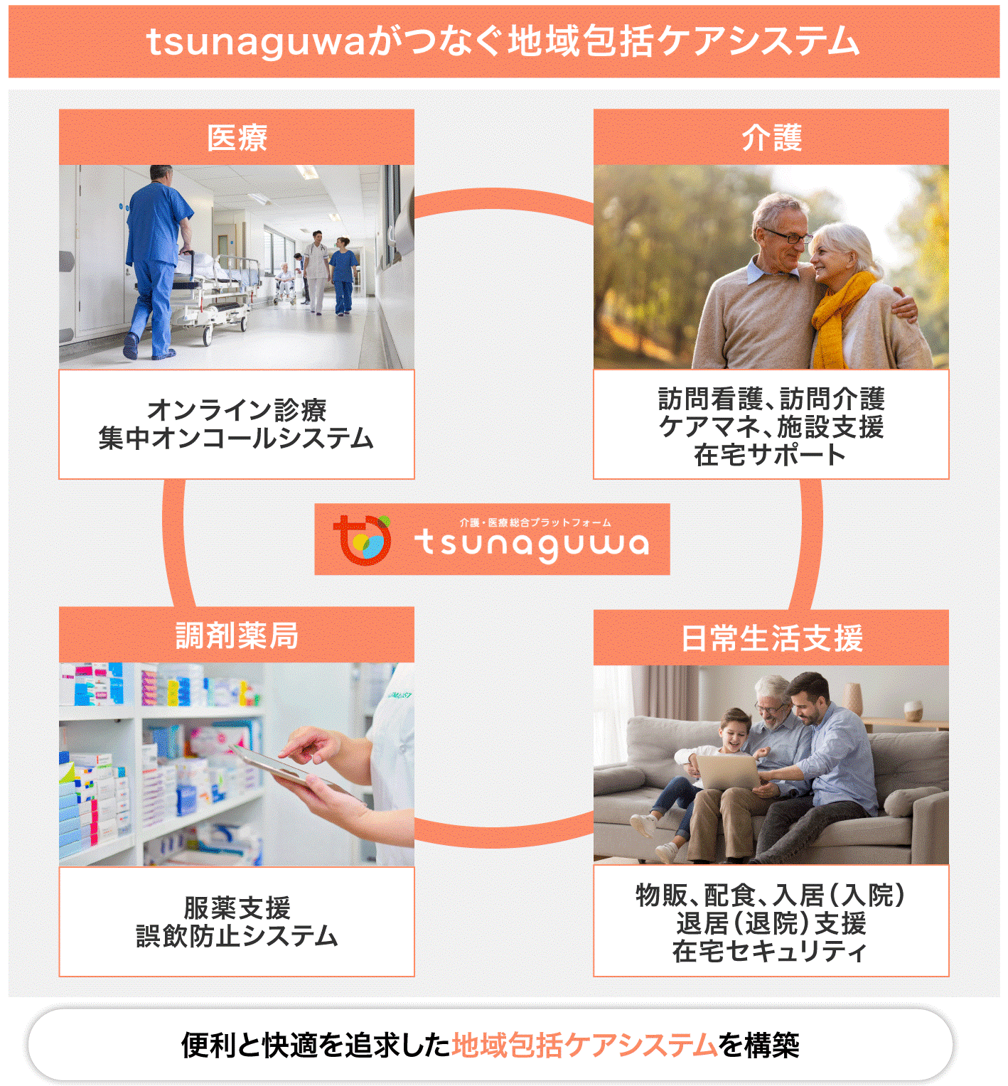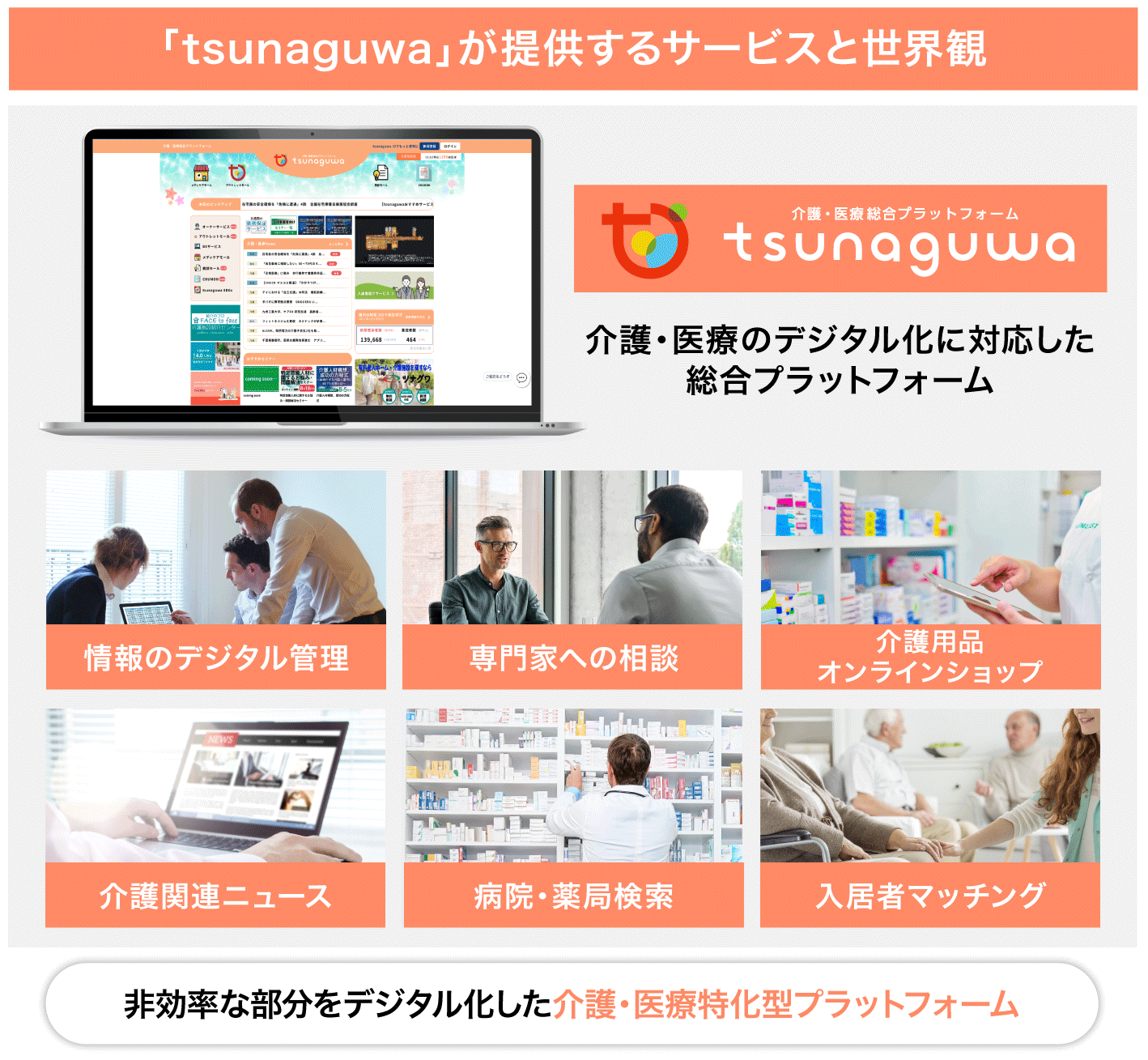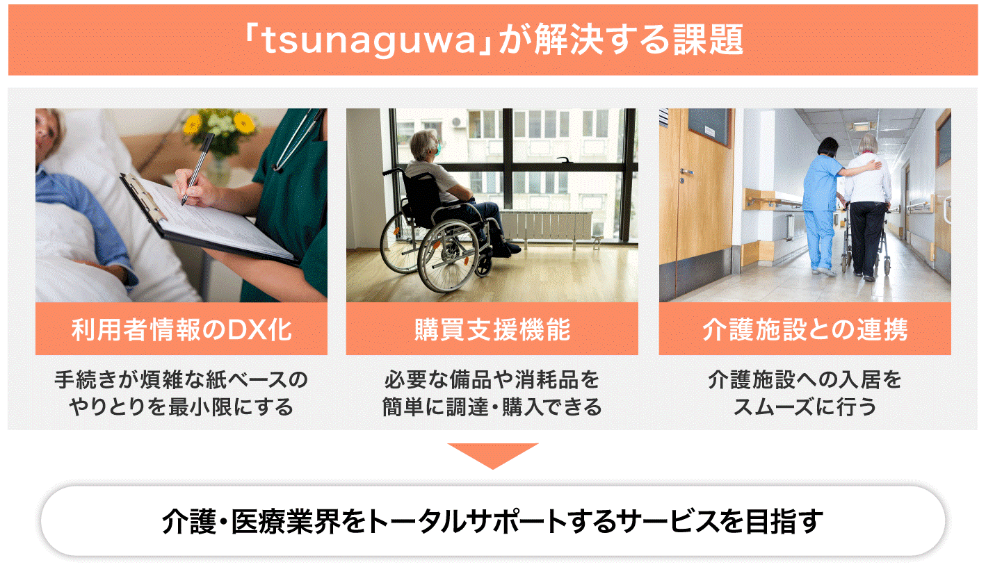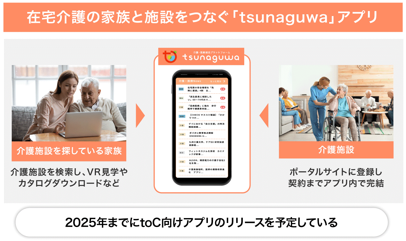 株式会社タリホーの運営する「tsunaguwa」は、来るべき超高齢化社会を支える要となる介護・医療業界を、ITによる総合的なサポートで便利に、そして効率化するためのサービスです。「tsunaguwa」のサービスは、基本無料で利用でき、既に約1,290の介護施設に導入されています(2022年7月時点)。