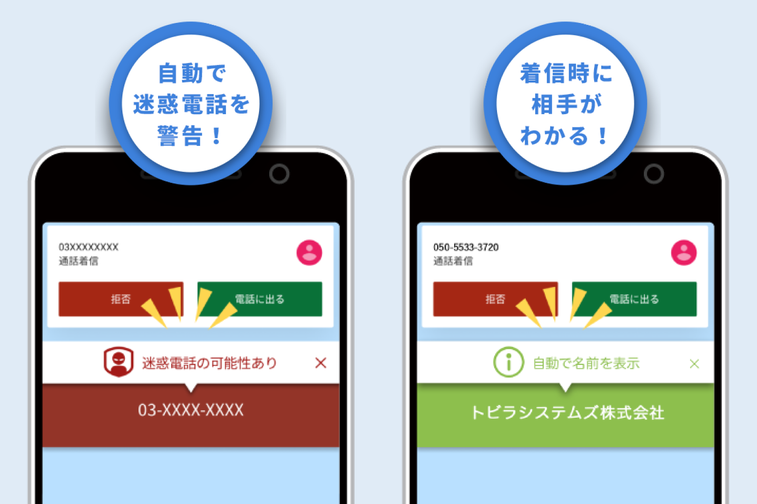 また、電話帳に登録していない番号も、トビラシステムズのデータベースと合致する場合は発着信時に事業者名称を表示するので、安心して電話に出られます。